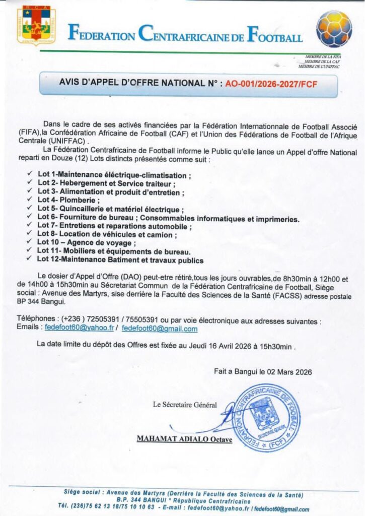 Banguii, le 13 Avril 2026 - LNC) La Fédération Centrafricaine de Football lance un appel d'offre public, en soi, pourquoi pas, même si cela relevait du ministère des sports, ou tout du moins en interne. Mais, vu le contenu de l'appel, on ne peut s'empêcher de penser que la Fédération est vraiment pauvre et que son appel d'offre est truffé de fautes d’orthographe, ça ne fait pas sérieux ! Et puis, parlons de la douloureuse, ils paieront comment ? Sachant qu'ils tirent le diable par la queue.